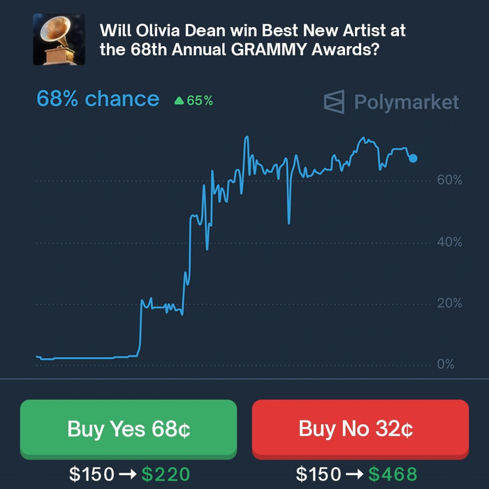 【赔率大涨❗️❗️❗️❗️】根据博彩预测平台Polymarket交易者的数据,Olivia Dean 有 68% 的几率赢得今年格莱美奖的 “最佳新人” 奖项。