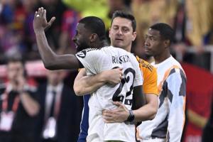 国王杯决赛中,吕迪格最后时刻朝裁判扔东西被罚下,还想冲进场内被助教拦住。